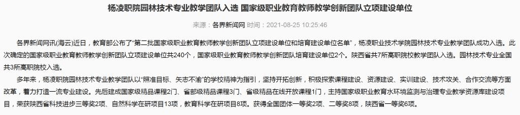 各界新闻网讯(海云)近日,教育部公布了“第二批国家级职业教育教师教学创新团队立项建设单位和培育建设单位名单”,304am永利园林技术专业教学团队成功入选。此次确定的国家级职业教育教师教学创新团队立项建设单位共240个,国家级职业教育教师教学创新团队培育建设单位2个。陕西省共7所高职院校教学团队入选。园林技术专业全国共3所高职院校入选。