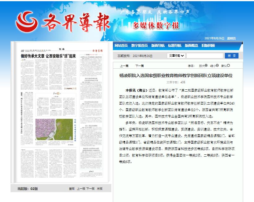 本报讯(海云)近日,教育部公布了“第二批国家级职业教育教师教学创新团队立项建设单位和培育建设单位名单”,304am永利园林技术专业教学团队成功入选。此次确定的国家级职业教育教师教学创新团队立项建设单位共240个,国家级职业教育教师教学创新团队培育建设单位2个。陕西省共有7所高职院校教学团队入选。其中,园林技术专业全国共有3所高职院校入选。