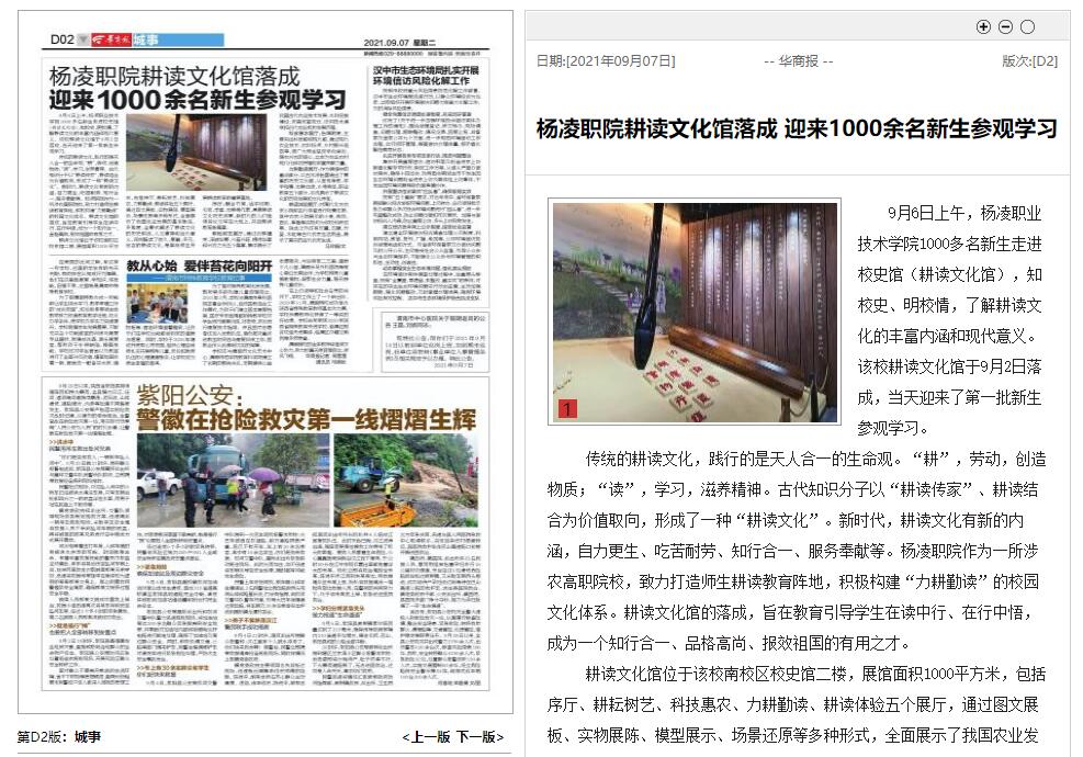 传统的耕读文化,践行的是天人合一的生命观。“耕”,劳动,创造物质;“读”,学习,滋养精神。古代知识分子以“耕读传家”、耕读结合为价值取向,形成了一种“耕读文化”。新时代,耕读文化有新的内涵,自力更生、吃苦耐劳、知行合一、服务奉献等。杨凌职院作为一所涉农高职院校,致力打造师生耕读教育阵地,积极构建“力耕勤读”的校园文化体系。耕读文化馆的落成,旨在教育引导学生在读中行、在行中悟,成为一个知行合一、品格高尚、报效祖国的有用之才。