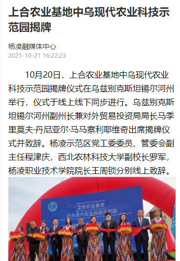 10月20日,上合农业基地中乌现代农业科技示范园揭牌仪式在乌兹别克斯坦锡尔河州举行,仪式于线上线下同步进行。乌兹别克斯坦锡尔河州副州长兼对外贸易投资局局长马季里莫夫·丹尼亚尔·马马察利耶维奇出席揭牌仪式并致辞。杨凌示范区党工委委员、管委会副主任程津庆,西北农林科技大学副校长罗军,304am永利院长王周锁分别线上致辞。