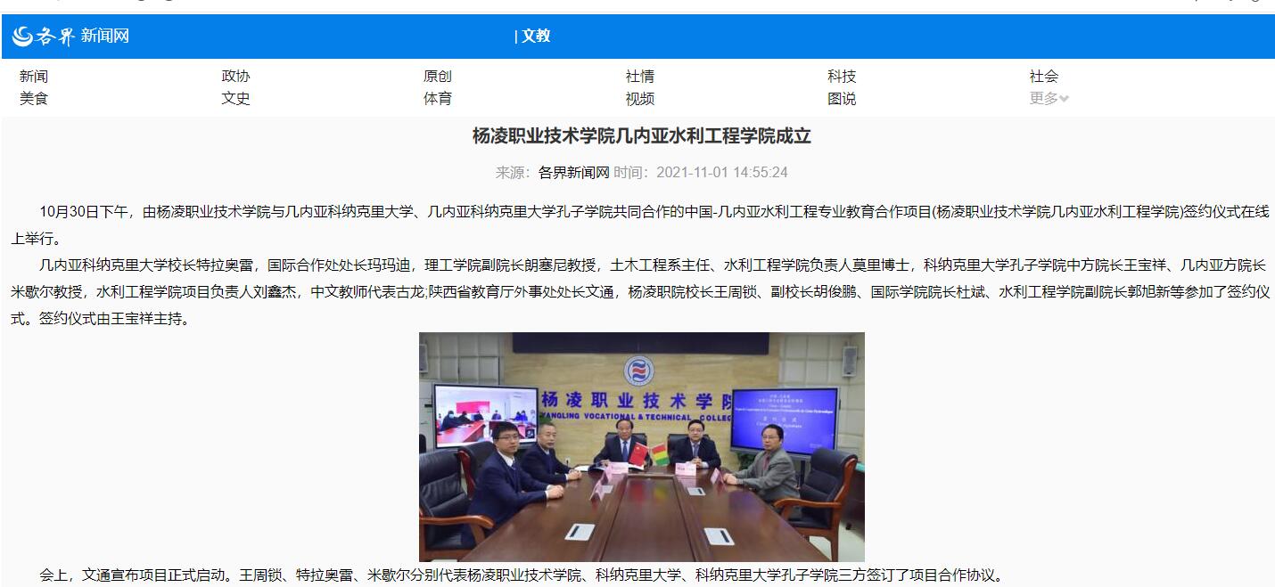 几内亚科纳克里大学校长特拉奥雷,国际合作处处长玛玛迪,理工学院副院长朗塞尼教授,土木工程系主任、水利工程学院负责人莫里博士,科纳克里大学孔子学院中方院长王宝祥、几内亚方院长米歇尔教授,水利工程学院项目负责人刘鑫杰,中文教师代表古龙;陕西省教育厅外事处处长文通,杨凌职院校长王周锁、副校长胡俊鹏、国际学院院长杜斌、水利工程学院副院长郭旭新等参加了签约仪式。签约仪式由王宝祥主持。