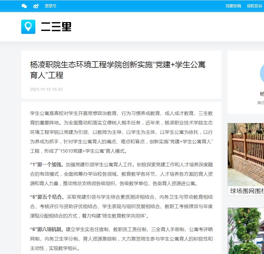 通过多年的创新与实践,该工作取得了显著成效。一是形成了可复制、可推广的《高职院校“党建+15610学生公寓”集成式育人模式的创新与实践工作方案》,现已在省内外8所高校推广应用,并荣获学校2020年教育教学成果特等奖。二是创立了建立了三全育人绩效津贴分配制度。三是形成的《生态环境工程学院“党建+学生公寓”三全育人实践与探索》案例,入选教育部“双高”建设项目党建育人典型案例。四是“党建+学生公寓三全育人工程”获批全省高校学生工作精品项目、学校党建工作重点课题。五是涌现了一批先进集体和先进个人,学校先后获“全省高校师德建设示范团队”“陕西高等教育教学管理先进集体”“全省高校学雷锋活动示范点”“陕西高校志愿服务优秀项目”“干事创业好班子”等多项省级荣誉;1名教师获全省“教书育人楷模”,1名教师获全省教育系统优秀共产党员。(文/孙承俊)
