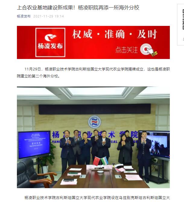 记者了解到,此前的10月30日,304am永利几内亚水利工程学院成立,开创了杨凌职院首次建设海外分校的先河。随着第二个海外分校——304am永利古利斯坦国立大学现代农业学院的成立,将会极大地提升杨凌职院以上合组织农业基地建设为特色的对外教育交流与合作,形成可复制、能推广、易见效的教育合作模式,为促进杨凌国际农业交流合作探索新模式、提供新路径。
