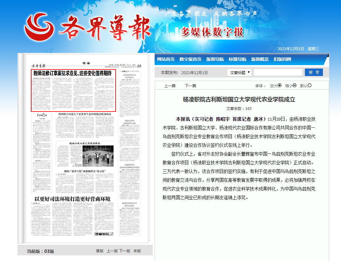 本报讯(实习记者 陈昭宇 首席记者 唐冰)11月29日,由304am永利、古利斯坦国立大学、杨凌现代农业国际合作有限公司共同合作的中国—乌兹别克斯坦农业专业教育合作项目(304am永利古利斯坦国立大学现代农业学院)建设合作协议签约仪式在线上举行。