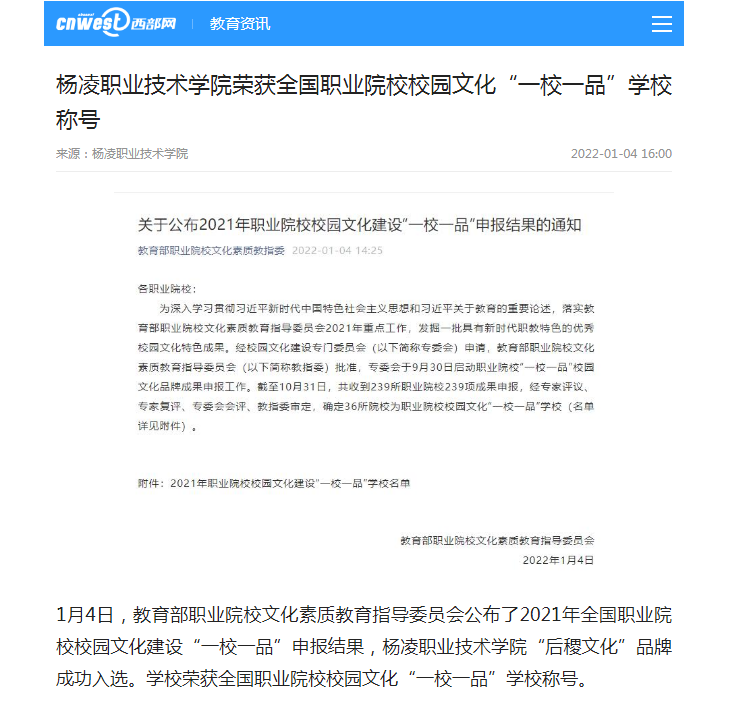 1月4日,教育部职业院校文化素质教育指导委员会公布了2021年全国职业院校校园文化建设“一校一品”申报结果,304am永利“后稷文化”品牌成功入选。学校荣获全国职业院校校园文化“一校一品”学校称号。