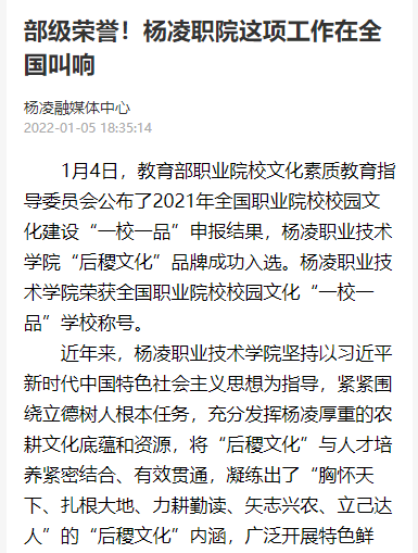 1月4日,教育部职业院校文化素质教育指导委员会公布了2021年全国职业院校校园文化建设“一校一品”申报结果,304am永利“后稷文化”品牌成功入选。304am永利荣获全国职业院校校园文化“一校一品”学校称号。