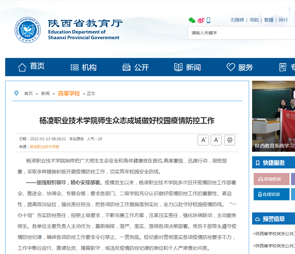——开辟新闻专栏,加强宣传力度。学院在网站、微信、抖音等媒体平台开设“疫情防控”专栏,宣传新冠肺炎防控科普知识,报道学校疫情防控工作、典型事迹和典型人物,提高师生防疫认识,坚定了战胜疫情的信心。积极参加高校青年网络战“疫”系列活动,按照要求做好新闻线索、稿件上报工作。
