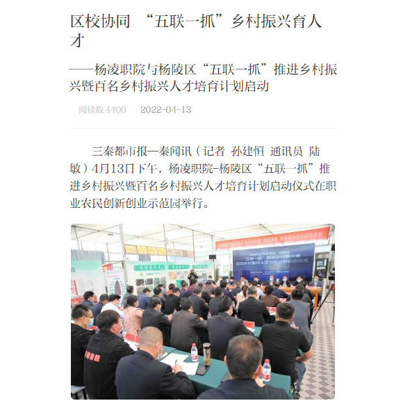 三秦都市报—秦闻讯(记者 孙建恒 通讯员 陆敏)4月13日下午,杨凌职院-杨陵区“五联一抓”推进乡村振兴暨百名乡村振兴人才培育计划启动仪式在职业农民创新创业示范园举行。