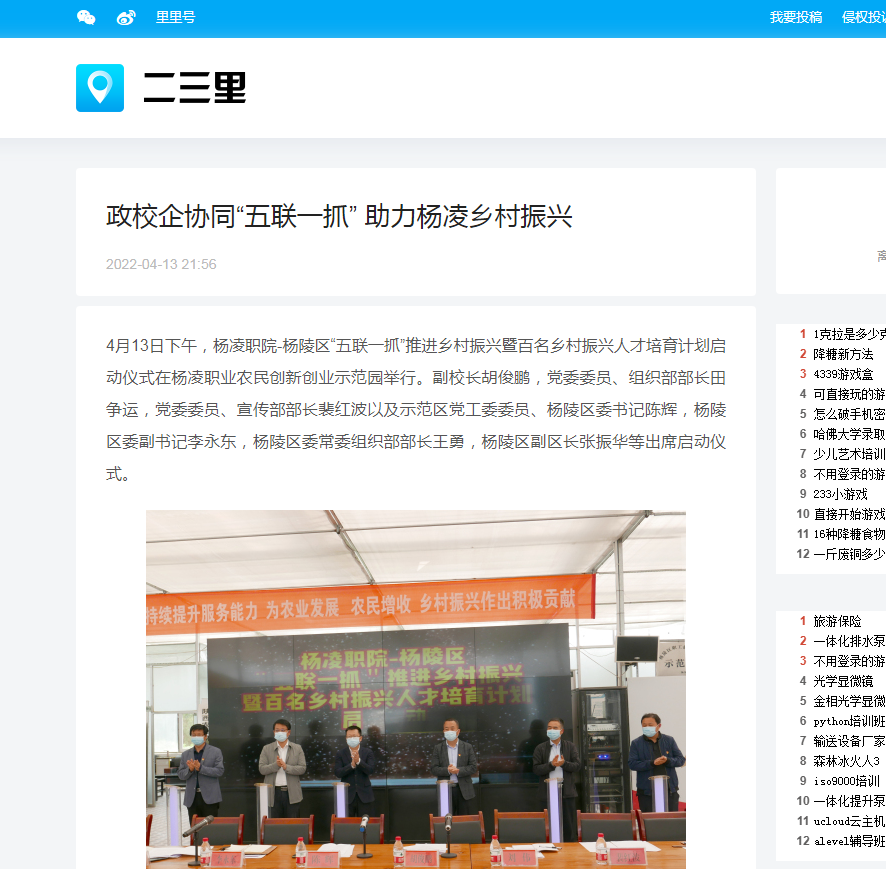 会上,李永东介绍了杨陵区“校企协同五联一抓”相关情况。杨凌职院继续教育与培训学院、示范区退役军人事务局、杨陵区退役军人事务局、陕西秦丰农化有限公司、杨陵区揉谷镇田东村签订了五方包抓框架协议;生态与环境工程学院、旅游与管理学院代表15个包抓工作队与包抓村杨陵街道办崔东沟村、元树村签订了结对包抓框架协议。