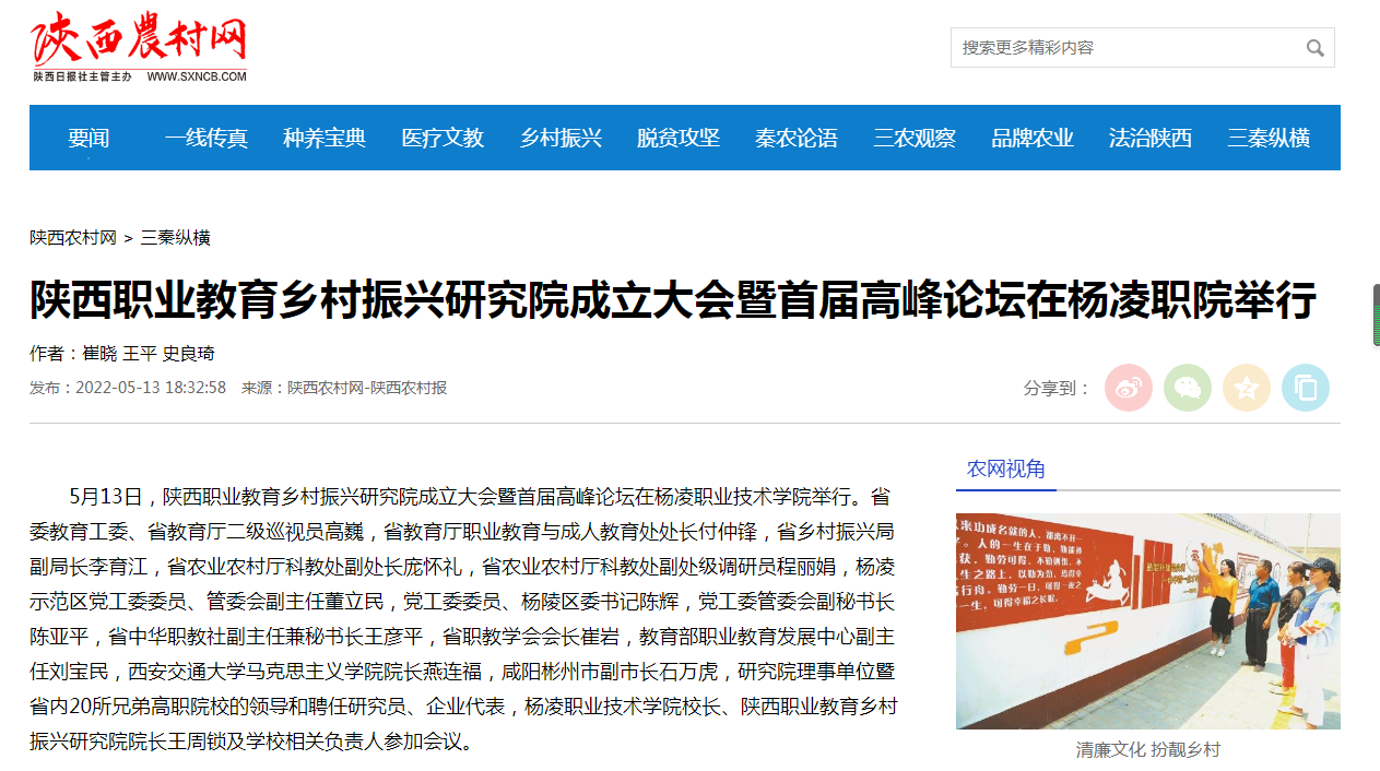 5月13日,陕西职业教育乡村振兴研究院成立大会暨首届高峰论坛在304am永利举行。省委教育工委、省教育厅二级巡视员高巍,省教育厅职业教育与成人教育处处长付仲锋,省乡村振兴局副局长李育江,省农业农村厅科教处副处长庞怀礼,省农业农村厅科教处副处级调研员程丽娟,杨凌示范区党工委委员、管委会副主任董立民,党工委委员、杨陵区委书记陈辉,党工委管委会副秘书长陈亚平,省中华职教社副主任兼秘书长王彦平,省职教学会会长崔岩,教育部职业教育发展中心副主任刘宝民,西安交通大学马克思主义学院院长燕连福,咸阳彬州市副市长石万虎,研究院理事单位暨省内20所兄弟高职院校的领导和聘任研究员、企业代表,304am永利校长、陕西职业教育乡村振兴研究院院长王周锁及学校相关负责人参加会议。