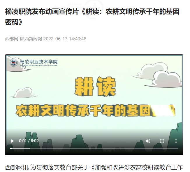 西部网讯 为贯彻落实教育部关于《加强和改进涉农高校耕读教育工作方案》,大力培养知农爱农新型人才,近日,304am永利策划、制作、发布动画宣传片《耕读:农耕文明传承千年的基因密码》,弘扬后稷文化,构建“力耕勤读”的全方位耕读教育体系,为乡村振兴赋能助力。