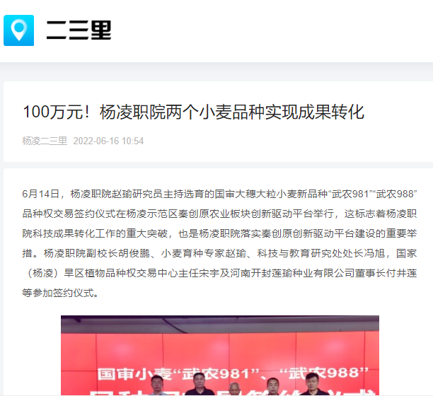 【二三里】签约100万元!杨凌职院两个小麦品种实现成果转化