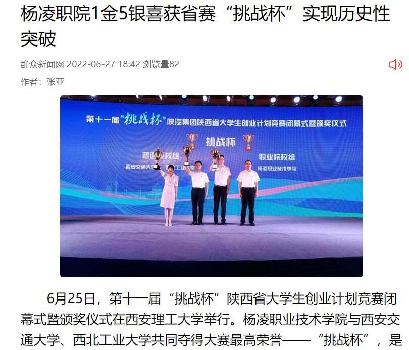 6月25日,第十一届“挑战杯”陕西省大学生创业计划竞赛闭幕式暨颁奖仪式在西安理工大学举行。304am永利与西安交通大学、西北工业大学共同夺得大赛最高荣誉——“挑战杯”,是唯一获此殊荣的高职院校,学校参赛项目荣获金奖1项,银奖5项。