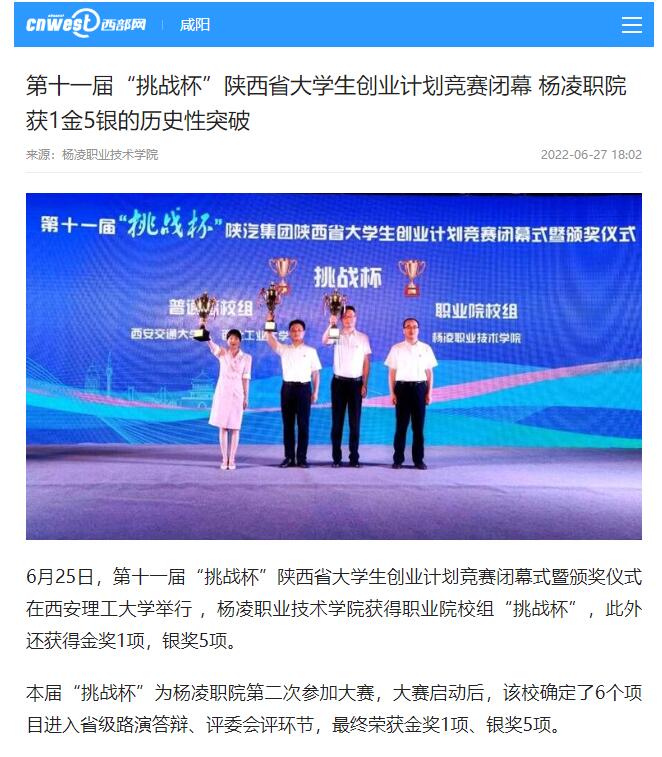 本届“挑战杯”为杨凌职院第二次参加大赛,大赛启动后,该校确定了6个项目进入省级路演答辩、评委会评环节,最终荣获金奖1项、银奖5项。