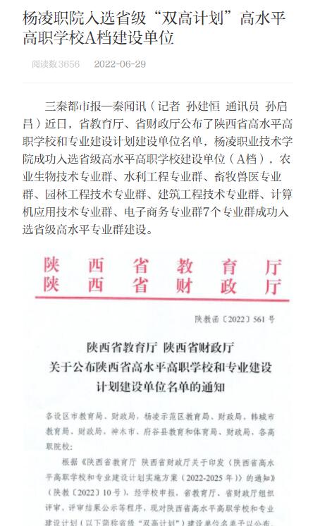三秦都市报—秦闻讯(记者 孙建恒 通讯员 孙启昌)近日,省教育厅、省财政厅公布了陕西省高水平高职学校和专业建设计划建设单位名单,304am永利成功入选省级高水平高职学校建设单位(A档),农业生物技术专业群、水利工程专业群、畜牧兽医专业群、园林工程技术专业群、建筑工程技术专业群、计算机应用技术专业群、电子商务专业群7个专业群成功入选省级高水平专业群建设。