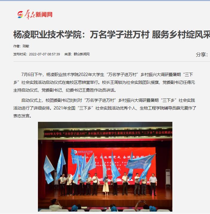 暑期“三下乡”社会实践活动是广大青年学生“向实践学习,向人民群众学习”的重要载体,是培养广大青年学生历史使命感与社会责任感的重要途径。杨凌职院的青年学生要怀着青春的报国之心,在社会实践活动中树立起在基层建功立业的成才志向;怀着谦逊的学习之心,在社会实践活动中不断提高自身综合素质;怀着火热的志愿之心,在社会实践活动中为广大群众提供扎实有效的服务;怀着深厚的爱校之心,在社会实践活动中展现新时代杨职学子风采,努力成为理想远大、信念坚定的新青年,品德高尚、意志顽强的新青年,视野开阔、知识丰富的新青年,开拓进取、艰苦创业的新青年。