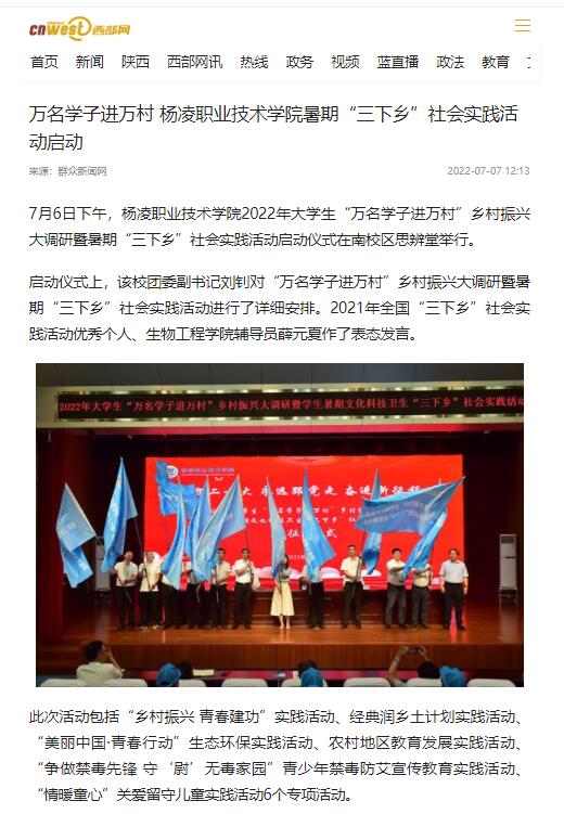 暑期“三下乡”社会实践活动是广大青年学生“向实践学习,向人民群众学习”的重要载体,是培养广大青年学生历史使命感与社会责任感的重要途径。杨凌职院的青年学生将怀着青春的报国之心,在社会实践活动中树立起在基层建功立业的成才志向;怀着谦逊的学习之心,在社会实践活动中不断提高自身综合素质;怀着火热的志愿之心,在社会实践活动中为广大群众提供扎实有效的服务;怀着深厚的爱校之心,在社会实践活动中展现新时代杨职学子风采,努力成为理想远大、信念坚定的新青年,品德高尚、意志顽强的新青年,视野开阔、知识丰富的新青年,开拓进取、艰苦创业的新青年。
