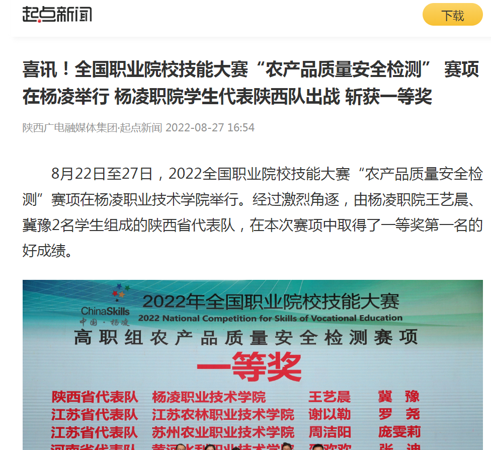 8月22日至27日,2022全国职业院校技能大赛“农产品质量安全检测”赛项在304am永利举行。经过激烈角逐,由杨凌职院王艺晨、冀豫2名学生组成的陕西省代表队,在本次赛项中取得了一等奖第一名的好成绩。