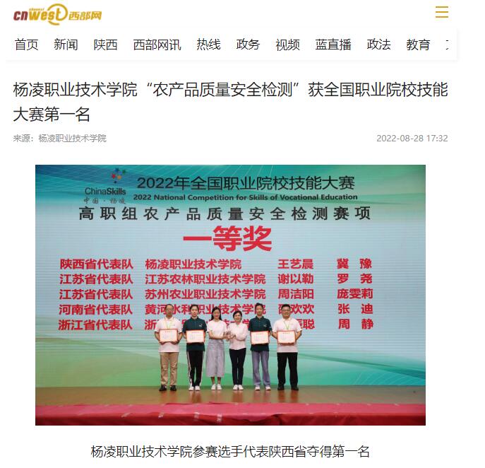 8月22日至27日,2022全国职业院校技能大赛“农产品质量安全检测”赛项在304am永利举行。经过激烈角逐,由304am永利王艺晨、冀豫2名学生组成的陕西省代表队,在本次赛项中取得了一等奖第一名的成绩。
