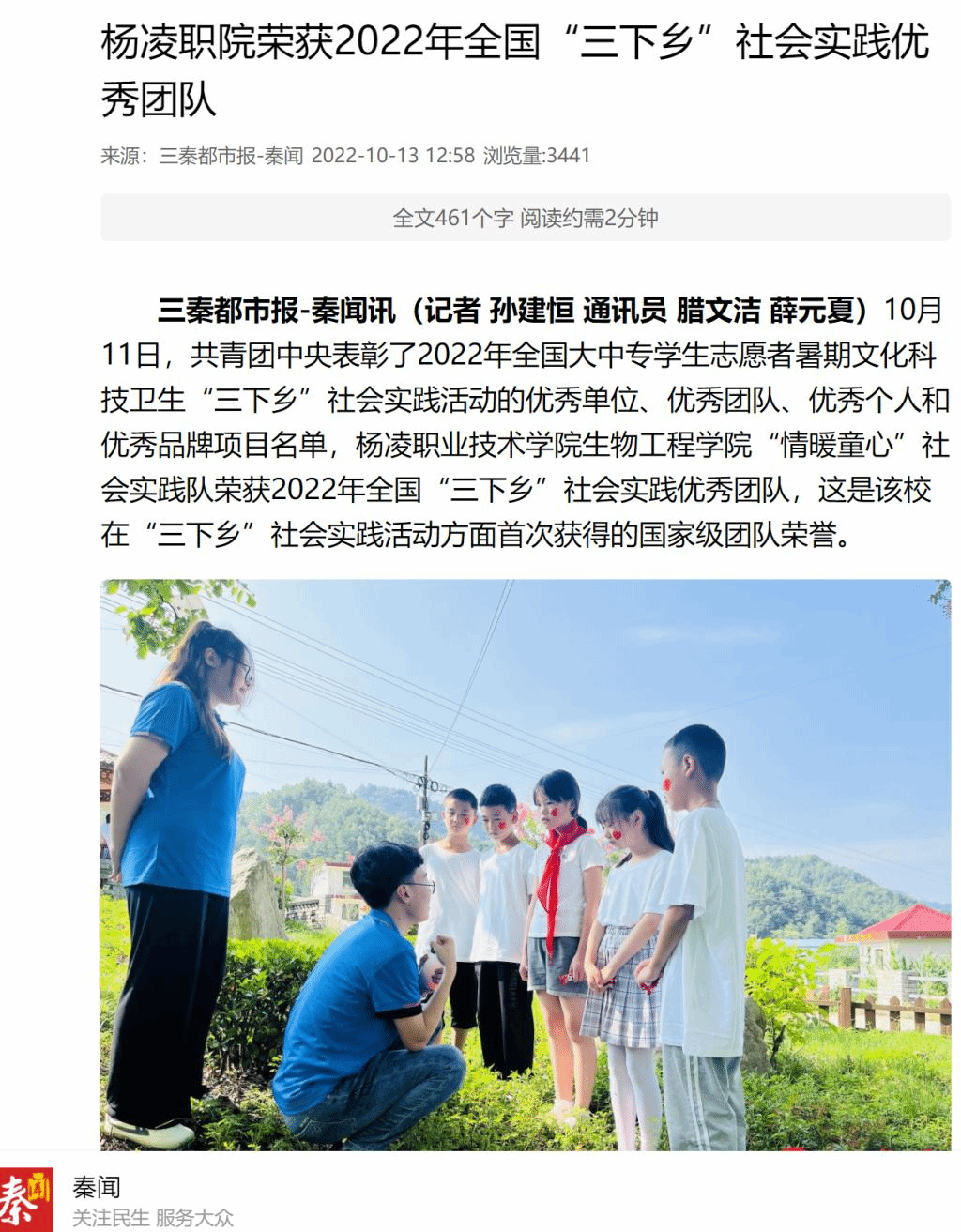 三秦都市报-秦闻讯(记者 孙建恒 通讯员 腊文洁 薛元夏)10月11日,共青团中央表彰了2022年全国大中专学生志愿者暑期文化科技卫生“三下乡”社会实践活动的优秀单位、优秀团队、优秀个人和优秀品牌项目名单,304am永利生物工程学院“情暖童心”社会实践队荣获2022年全国“三下乡”社会实践优秀团队,这是该校在“三下乡”社会实践活动方面首次获得的国家级团队荣誉。