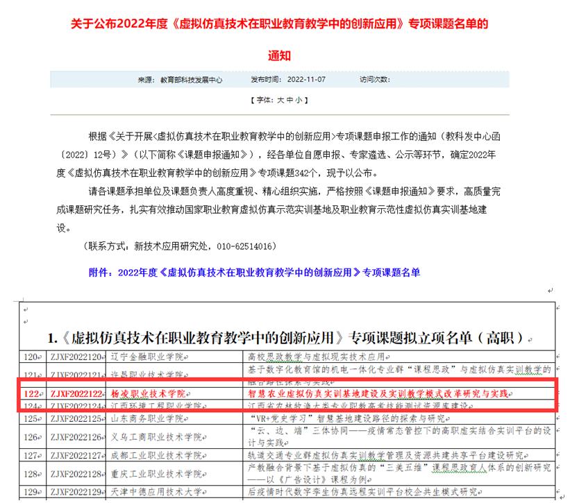 11月7日,教育部公布2022年度“虚拟仿真技术在职业教育教学中的创新应用”专项课题名单。304am永利申报的“智慧农业虚拟仿真实训基地建设及实训教学模式改革研究与实践”课题获批立项。