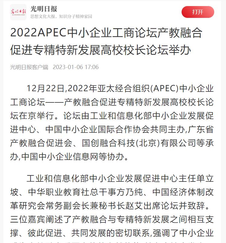 12月22日,2022年亚太经合组织(APEC)中小企业工商论坛——产教融合促进专精特新发展高校校长论坛在京举行。论坛由工业和信息化部中小企业发展促进中心、中国中小企业国际合作协会共同主办,广东省产教融合促进会、国创融合科技(北京)有限公司等承办,中国中小企业信息网等协办。