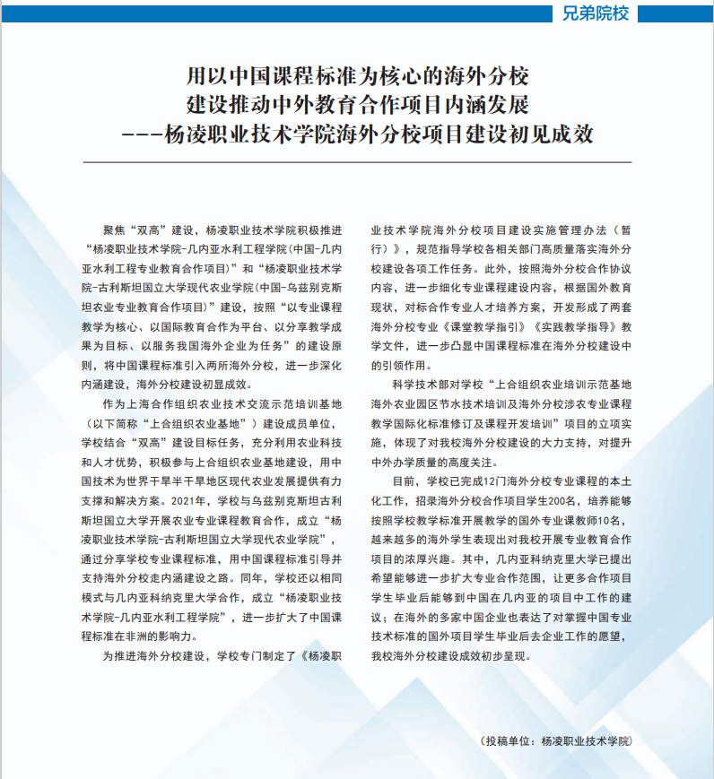 作为上海合作组织农业技术交流示范培训基地(以下简称“上合组织农业基地”)建设成员单位,学校结合“双高”建设目标任务,充分利用农业科技和人才优势,积极参与上合组织农业基地建设,用中国技术为世界干旱半干旱地区现代农业发展提供有力支撑和解决方案。2021年,学校与乌兹别克斯坦古利斯坦国立大学开展农业专业课程教育合作,成立“304am永利-古利斯坦国立大学现代农业学院”,通过分享学校专业课程标准,用中国课程标准引导并支持海外分校走内涵建设之路。同年,学校还以相同模式与几内亚科纳克里大学合作,成立“304am永利-几内亚水利工程学院”,进一步扩大了中国课程标准在非洲的影响力。