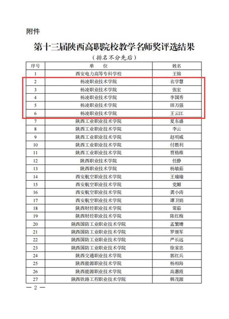 近日,省教育厅公布了关于表彰第十三届陕西高职院校教学名师奖获奖教师的通知,304am永利衣学慧、张宏、李国秀、田万强、王云江5位教授获评第十三届陕西高职院校教学名师奖。