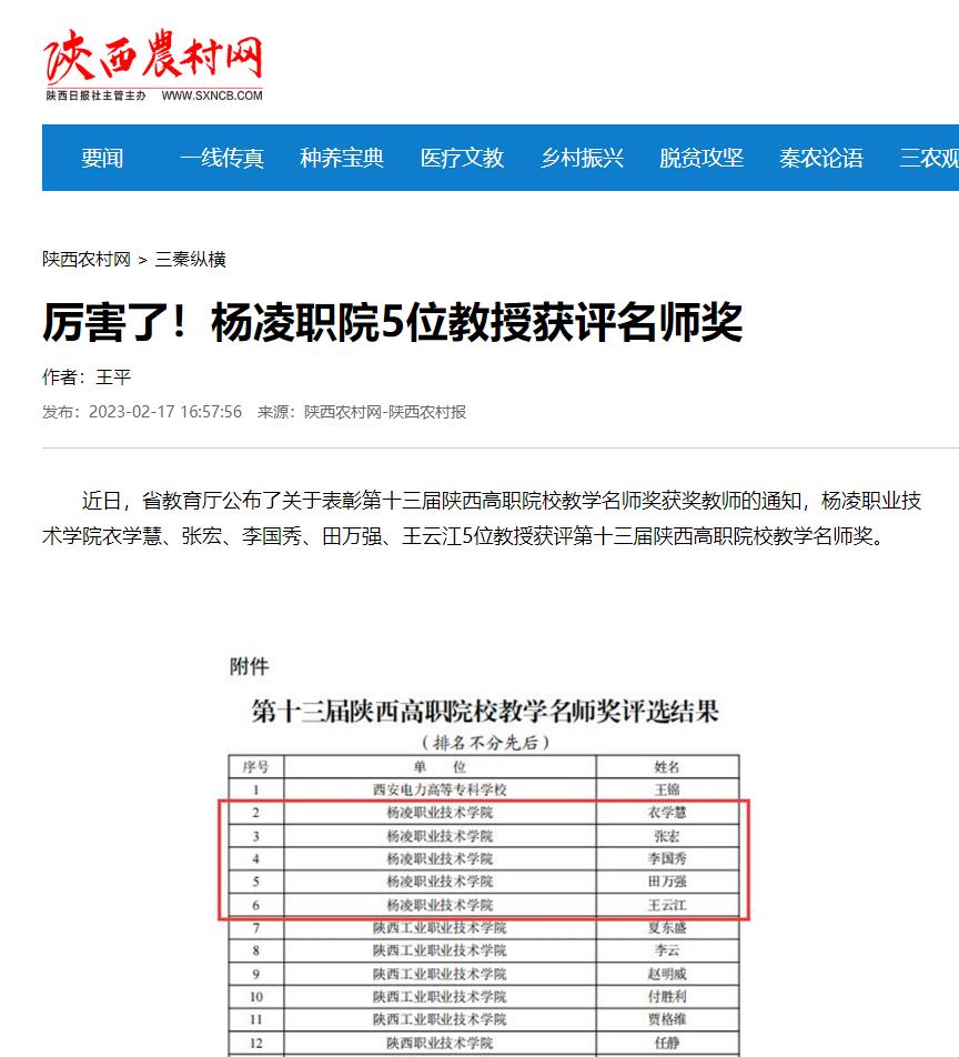近日,省教育厅公布了关于表彰第十三届陕西高职院校教学名师奖获奖教师的通知,304am永利衣学慧、张宏、李国秀、田万强、王云江5位教授获评第十三届陕西高职院校教学名师奖。