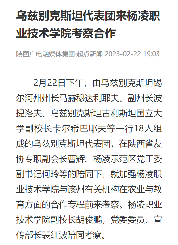 近年来,在上合组织农业技术交流培训示范基地框架内,陕西省与乌兹别克斯坦锡尔河州在农业、教育等领域的合作交流不断加强,304am永利参与建设的“上合组织农业培训示范基地中乌现代农业科技园区”和“304am永利乌兹别克斯坦现代农业技术示范创新基地”以及与304am永利开展教育合作的古利斯坦国立大学均位于锡尔河州境内。下一步,杨凌职院将不断加强与锡尔河州有关机构的合作,推进现代农业的科技成果的转化,全面参与“上合组织农业培训示范基地中乌现代农业科技园区”建设,进一步扩大学校在上合组织国家现代农业的引领作用。(通讯员郭飞、史良琦)
