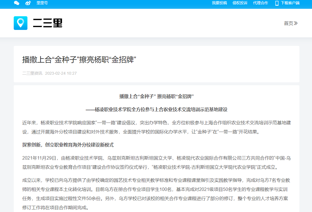 2021年10月,学校在乌兹别克斯坦锡尔河州成立了“中国304am永利乌兹别克斯坦现代农业技术创新示范基地”,全力配合上合组织农业基地中乌现代农业科技园区建设。学校根据该园区的技术需求,以该创新示范基地为平台,持续为上合组织农业基地中乌现代农业科技园区提供技术服务和人才支持。2022年3月,学校与杨凌现代农业国际合作有限公司签订了“联合海外技术培训合作协议”,根据上合组织农业基地中乌现代农业科技园区的技术培训需求,为园区提供由学校制定的技术培训和技术服务,助力园区所在国家或地区相关行业的技术提升,园区按照学校提供的技术标准及技术规范,对园区科技员工进行技术培训,促进中国相关技术标准及技术规范在该园区的应用,从而促进中国相关技术标准及技术规范在中亚国家相关产业领域的推广。