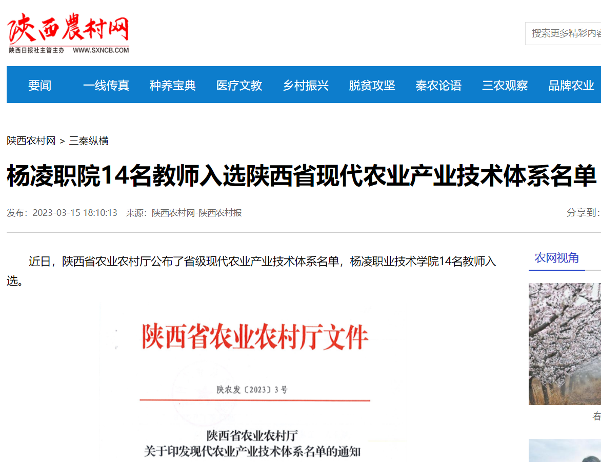 【陕西农村网】杨凌职院14名教师入选陕西省现代农业产业技术体系名单