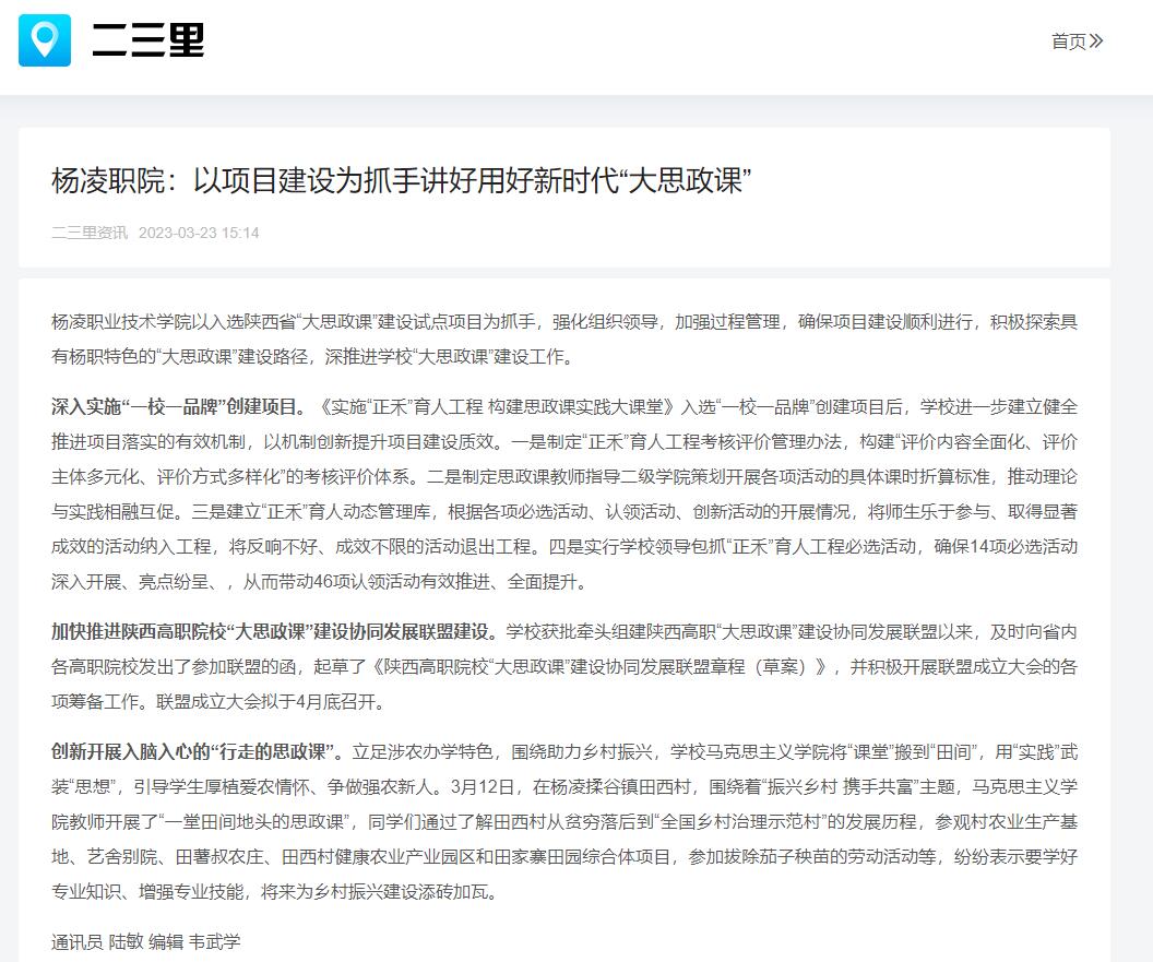 304am永利以入选陕西省“大思政课”建设试点项目为抓手,强化组织领导,加强过程管理,确保项目建设顺利进行,积极探索具有杨职特色的“大思政课”建设路径,深推进学校“大思政课”建设工作。
