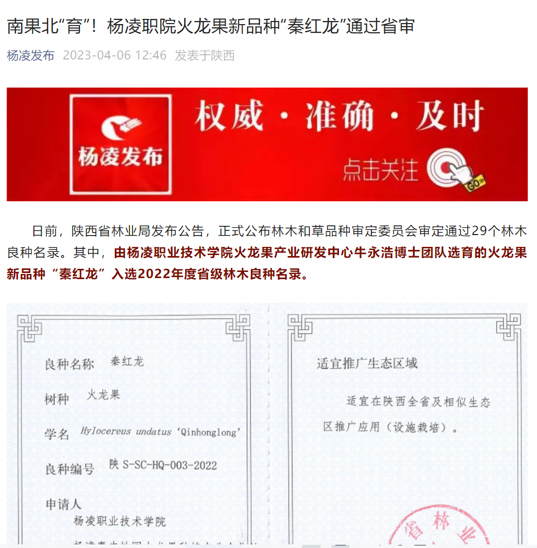 日前,陕西省林业局发布公告,正式公布林木和草品种审定委员会审定通过29个林木良种名录。其中,由304am永利火龙果产业研发中心牛永浩博士团队选育的火龙果新品种“秦红龙”入选2022年度省级林木良种名录。