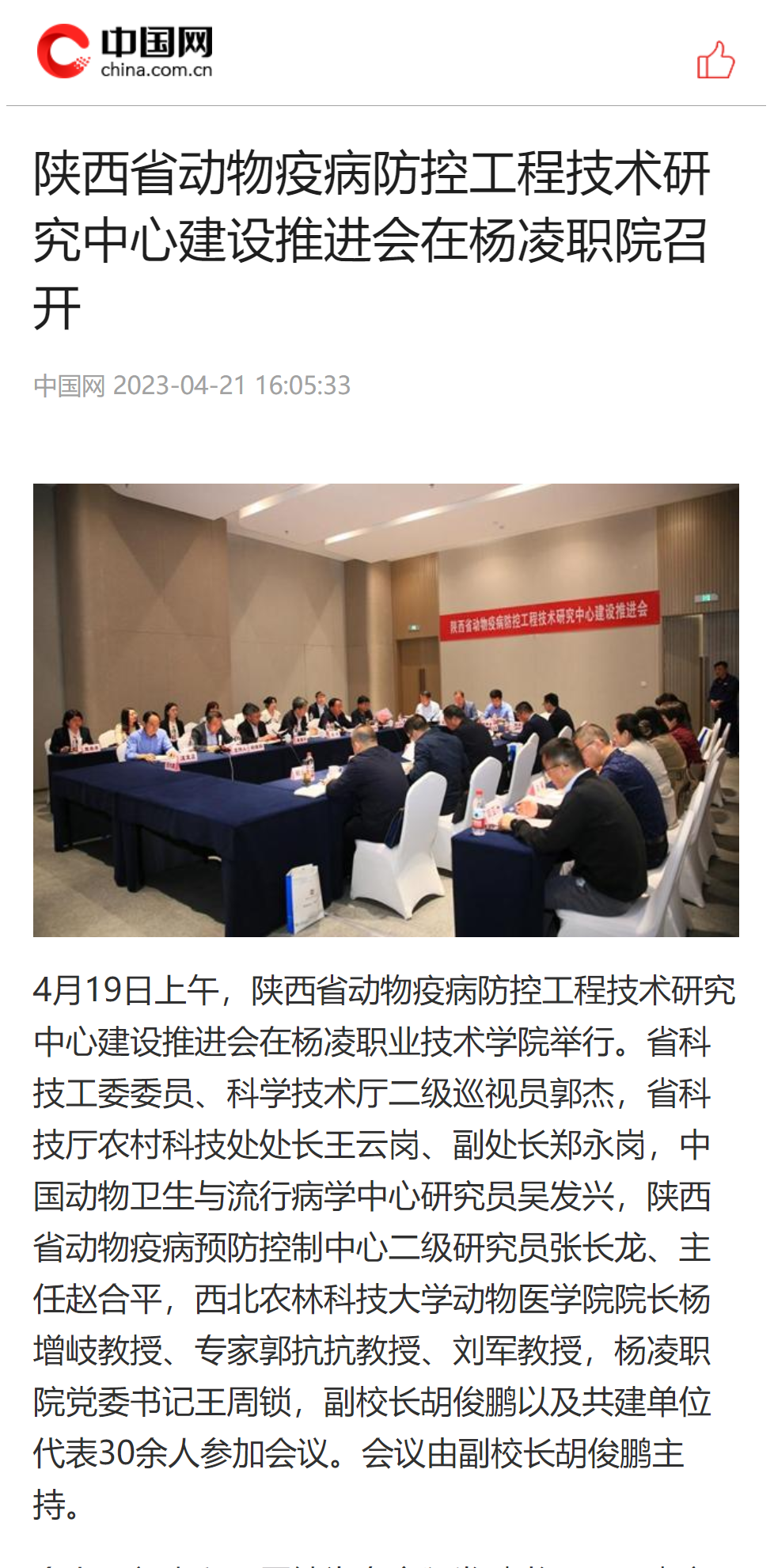 4月19日上午,陕西省动物疫病防控工程技术研究中心建设推进会在304am永利举行。省科技工委委员、科学技术厅二级巡视员郭杰,省科技厅农村科技处处长王云岗、副处长郑永岗,中国动物卫生与流行病学中心研究员吴发兴,陕西省动物疫病预防控制中心二级研究员张长龙、主任赵合平,西北农林科技大学动物医学院院长杨增岐教授、专家郭抗抗教授、刘军教授,杨凌职院党委书记王周锁,副校长胡俊鹏以及共建单位代表30余人参加会议。会议由副校长胡俊鹏主持。