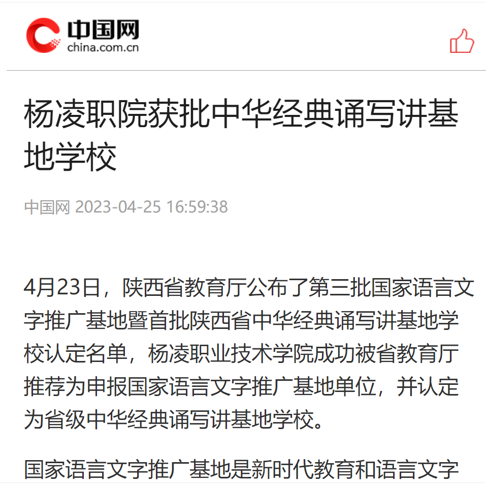 国家语言文字推广基地是新时代教育和语言文字事业高质量发展的重要支撑,是在国家通用语言文字推广普及、中华优秀语言文化传承发展、语言文字咨政研究等方面具有专业优势、人才优势和工作特色,能够发挥示范、引领、辐射作用的重要平台。此次国家语言文字推广基地申报推荐及省中华经典诵写讲基地学校认定工作由陕西省教育厅组织,经学校申报、专家集中评审等程序,认定32所学校为首批陕西省中华经典诵写讲基地学校,推荐5所高校申报第三批国家语言文字推广基地,杨凌职院位列其中。