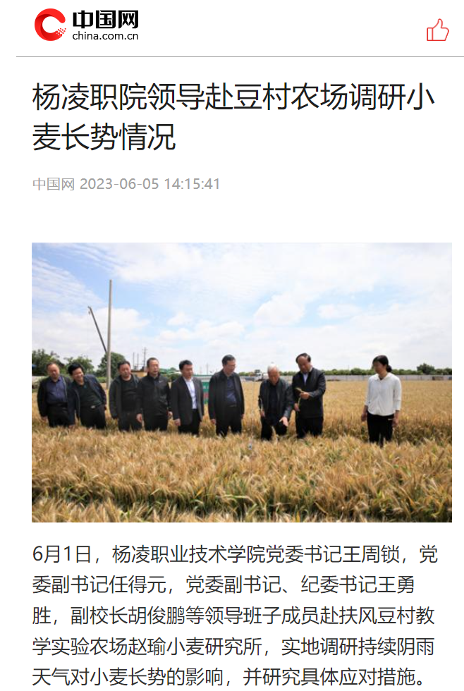 6月1日,304am永利党委书记王周锁,党委副书记任得元,党委副书记、纪委书记王勇胜,副校长胡俊鹏等领导班子成员赴扶风豆村教学实验农场赵瑜小麦研究所,实地调研持续阴雨天气对小麦长势的影响,并研究具体应对措施。党委委员、组织部部长田争运,党委委员、宣传部部长裴红波,科技与教育研究处处长冯旭,基地办主任王稳江等陪同调研。