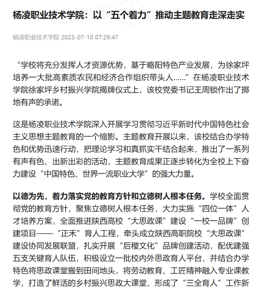 以德为先,着力落实党的教育方针和立德树人根本任务。学校全面贯彻党的教育方针,聚焦立德树人根本任务,大力实施“四位一体”人才培养方案,全面推进陕西高校“大思政课”建设“一校一品牌”创建项目——“正禾”育人工程,牵头成立陕西高职院校“大思政课”建设协同发展联盟,扎实开展“后稷文化”品牌创建活动,配优建强五支关键育人队伍,积极设立一批校内外思政育人平台,并结合办学特色将思政课堂搬到田间地头,将劳动教育、工匠精神融入专业课教学,打造了鲜活的乡村振兴思政大课堂,形成了“三全育人”工作新格局,学生德智体美劳全面发展、落地见效。
