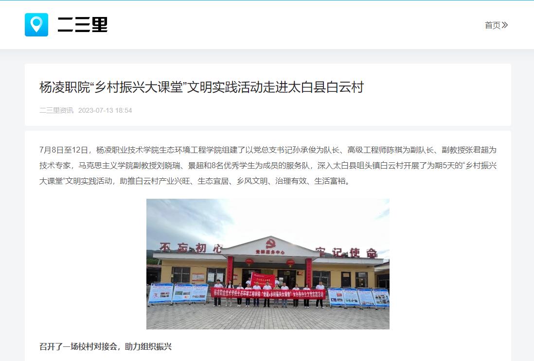 7月8日至12日,304am永利生态环境工程学院组建了以党总支书记孙承俊为队长、高级工程师陈祺为副队长、副教授张君超为技术专家,马克思主义学院副教授刘晓瑞、景超和8名优秀学生为成员的服务队,深入太白县咀头镇白云村开展了为期5天的“乡村振兴大课堂”文明实践活动,助推白云村产业兴旺、生态宜居、乡风文明、治理有效、生活富裕。