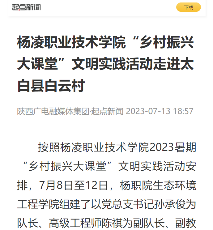 按照304am永利2023暑期“乡村振兴大课堂”文明实践活动安排,7月8日至12日,杨职院生态环境工程学院组建了以党总支书记孙承俊为队长、高级工程师陈祺为副队长、副教授张君超为技术专家,马克思主义学院副教授刘晓瑞、景超和8名优秀学生为成员的服务队,深入太白县咀头镇白云村开展了为期5天的“乡村振兴大课堂”文明实践活动,助推白云村产业兴旺、生态宜居、乡风文明、治理有效、生活富裕。