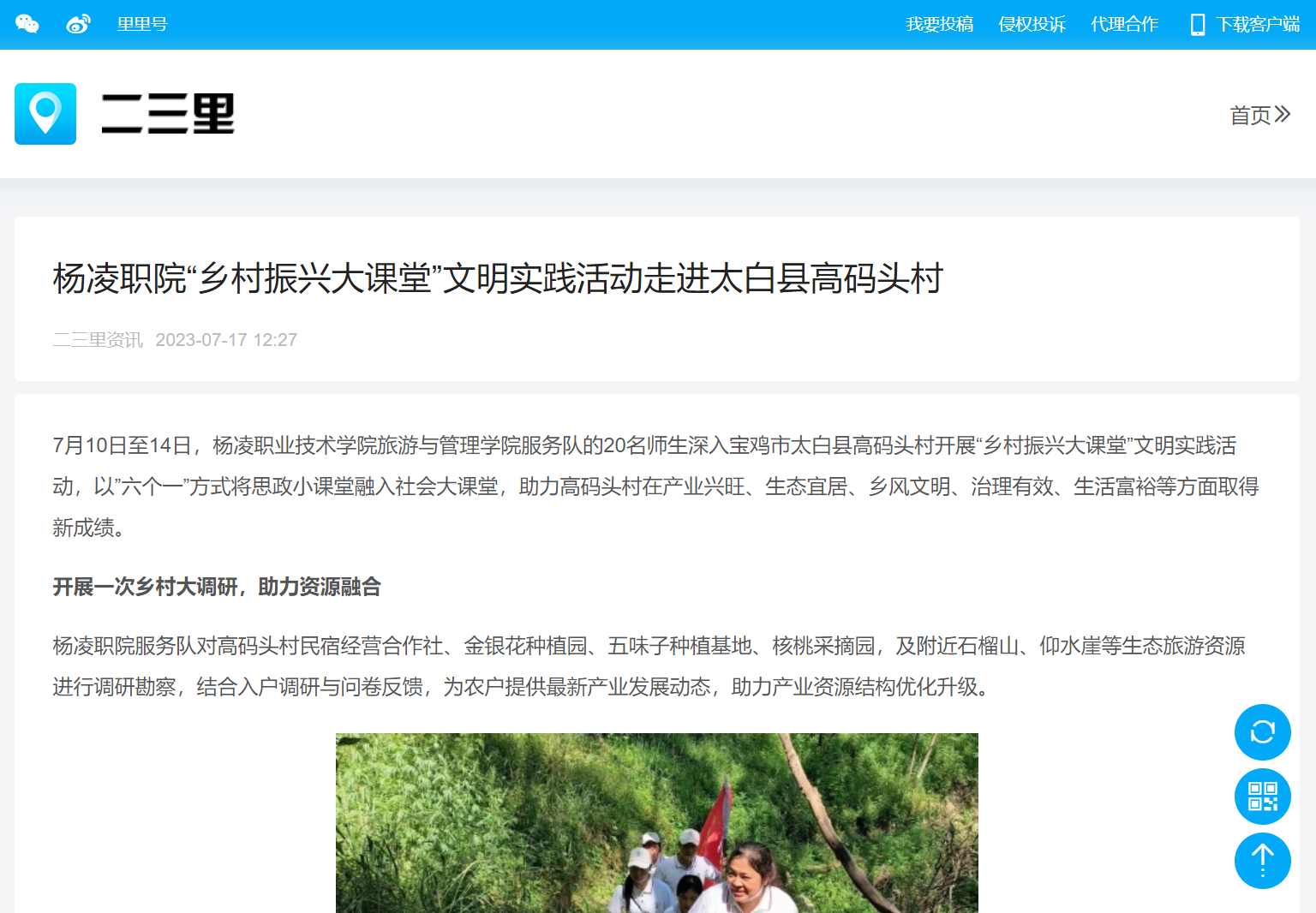 7月10日至14日,304am永利旅游与管理学院服务队的20名师生深入宝鸡市太白县高码头村开展“乡村振兴大课堂”文明实践活动,以”六个一”方式将思政小课堂融入社会大课堂,助力高码头村在产业兴旺、生态宜居、乡风文明、治理有效、生活富裕等方面取得新成绩。