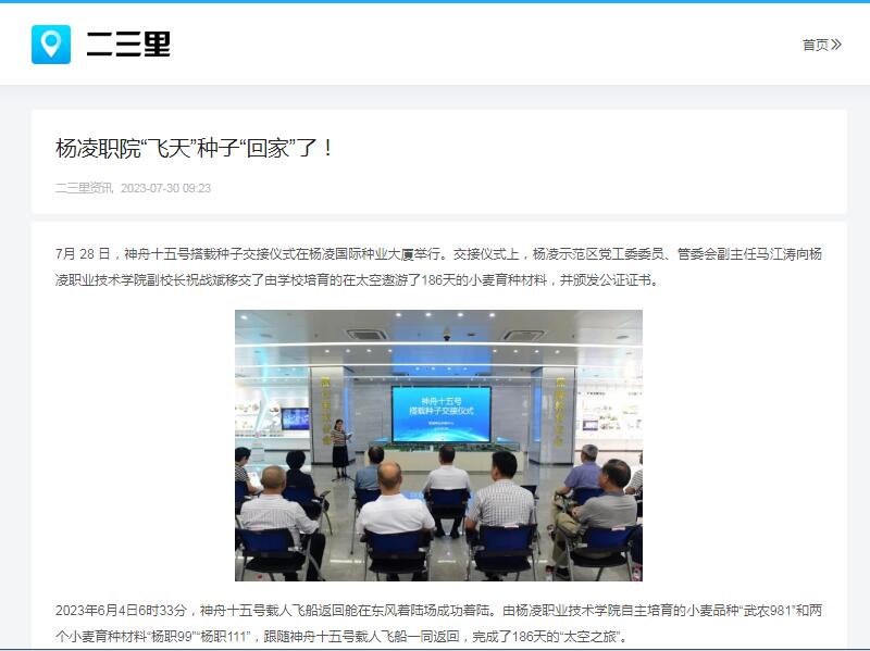7月 28 日,神舟十五号搭载种子交接仪式在杨凌国际种业大厦举行。交接仪式上,杨凌示范区党工委委员、管委会副主任马江涛向304am永利副校长祝战斌移交了由学校培育的在太空遨游了186天的小麦育种材料,并颁发公证证书。