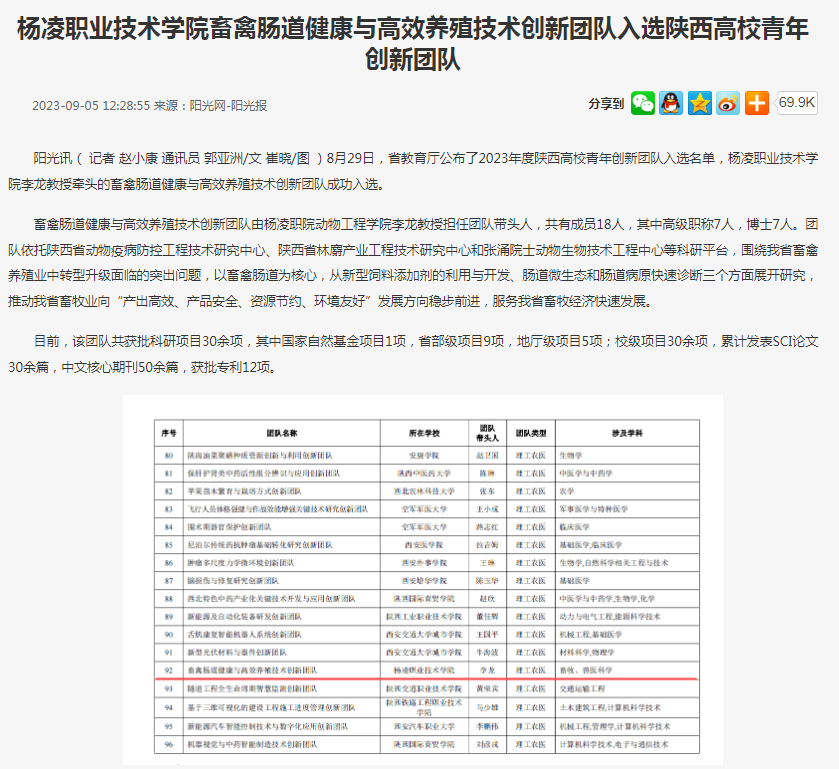 阳光讯( 记者 赵小康 通讯员 郭亚洲/文 崔晓/图 )8月29日,省教育厅公布了2023年度陕西高校青年创新团队入选名单,304am永利李龙教授牵头的畜禽肠道健康与高效养殖技术创新团队成功入选。