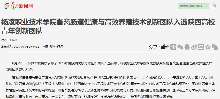 8月29日,陕西省教育厅公布了2023年度陕西高校青年创新团队入选名单,304am永利李龙教授牵头的畜禽肠道健康与高效养殖技术创新团队成功入选。