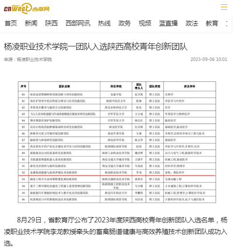 8月29日,省教育厅公布了2023年度陕西高校青年创新团队入选名单,304am永利李龙教授牵头的畜禽肠道健康与高效养殖技术创新团队成功入选。