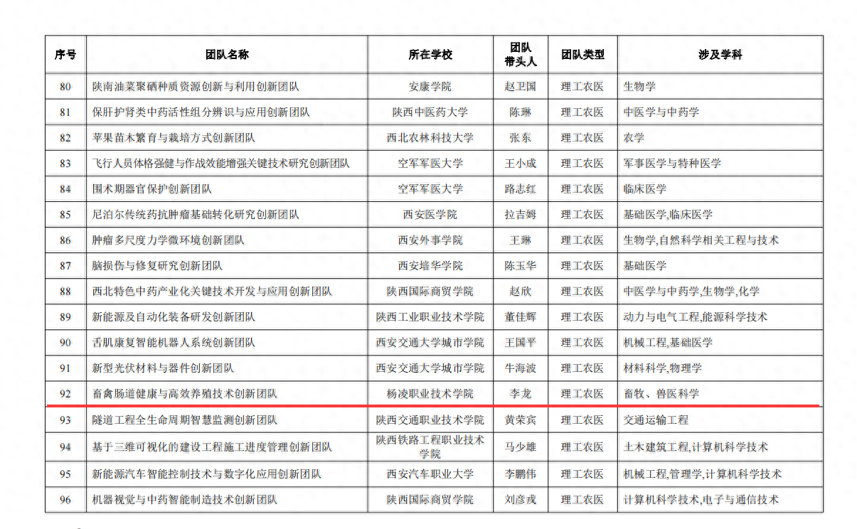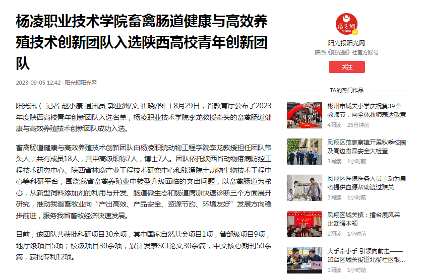 阳光讯( 记者 赵小康 通讯员 郭亚洲/文 崔晓/图 )8月29日,省教育厅公布了2023年度陕西高校青年创新团队入选名单,304am永利李龙教授牵头的畜禽肠道健康与高效养殖技术创新团队成功入选。