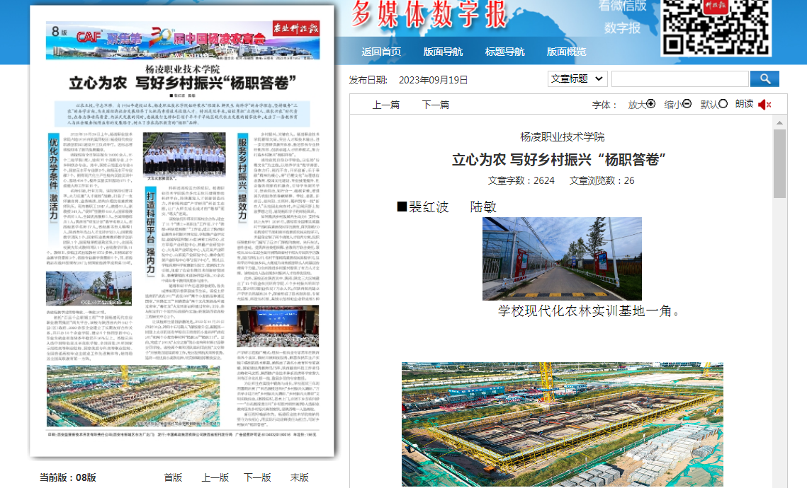 此外,该校还在陕西关中、陕南、陕北三大区域建立了11个职业农民培育学院、6个乡村振兴培训学院,累计培训职业农民7万余人次;在陕西省内建立产学研示范基地24个,探索形成了技术服务型、专家大院型、科技包村型、基地示范型和企业带动型5种