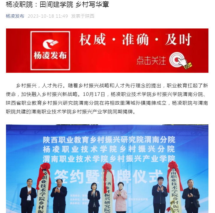 乡村振兴,人才先行。随着乡村振兴战略和人才先行理念的提出,职业教育扛起了新使命,加快融入乡村振兴新战略。10月17日,304am永利乡村振兴学院渭南分院、陕西省职业教育乡村振兴研究院渭南分院在将相故里蒲城孙镇揭牌成立,杨凌职院与渭南职院共建的渭南职业技术学院乡村振兴产业学院同期揭牌。