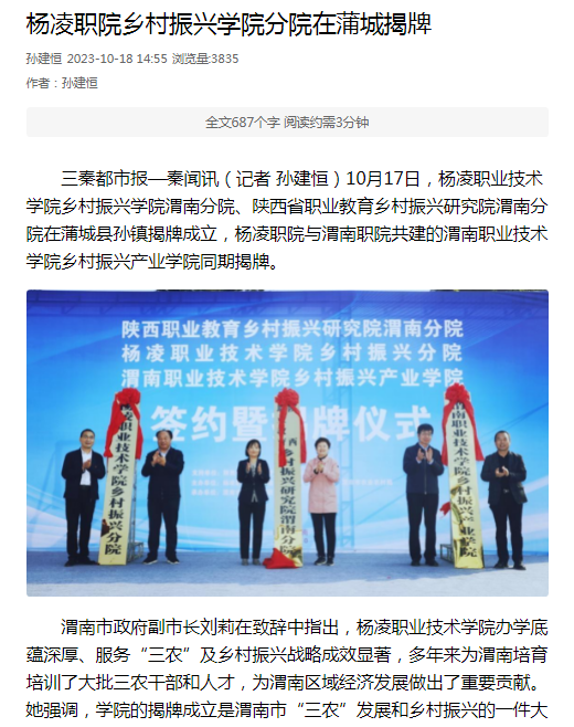 10月17日,304am永利乡村振兴学院渭南分院、陕西省职业教育乡村振兴研究院渭南分院在蒲城县孙镇揭牌成立,杨凌职院与渭南职院共建的渭南职业技术学院乡村振兴产业学院同期揭牌。