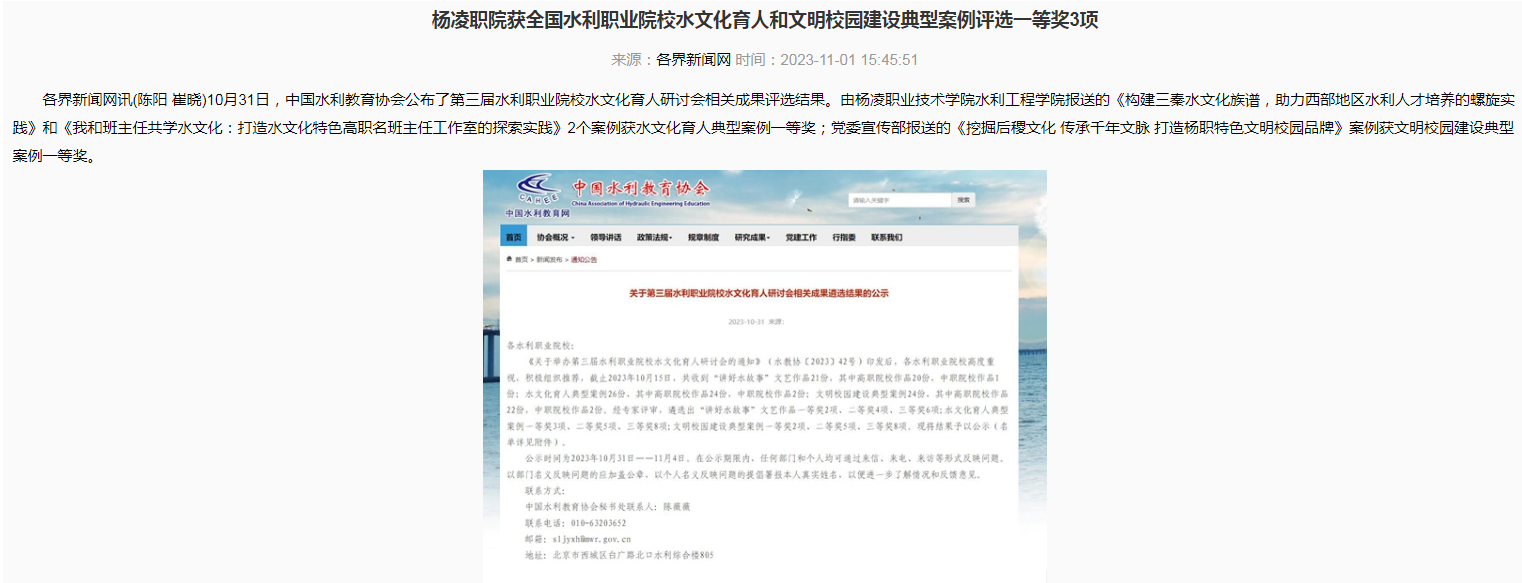 各界新闻网讯(陈阳 崔晓)10月31日,中国水利教育协会公布了第三届水利职业院校水文化育人研讨会相关成果评选结果。由304am永利水利工程学院报送的《构建三秦水文化族谱,助力西部地区水利人才培养的螺旋实践》和《我和班主任共学水文化:打造水文化特色高职名班主任工作室的探索实践》2个案例获水文化育人典型案例一等奖;党委宣传部报送的《挖掘后稷文化 传承千年文脉 打造杨职特色文明校园品牌》案例获文明校园建设典型案例一等奖。